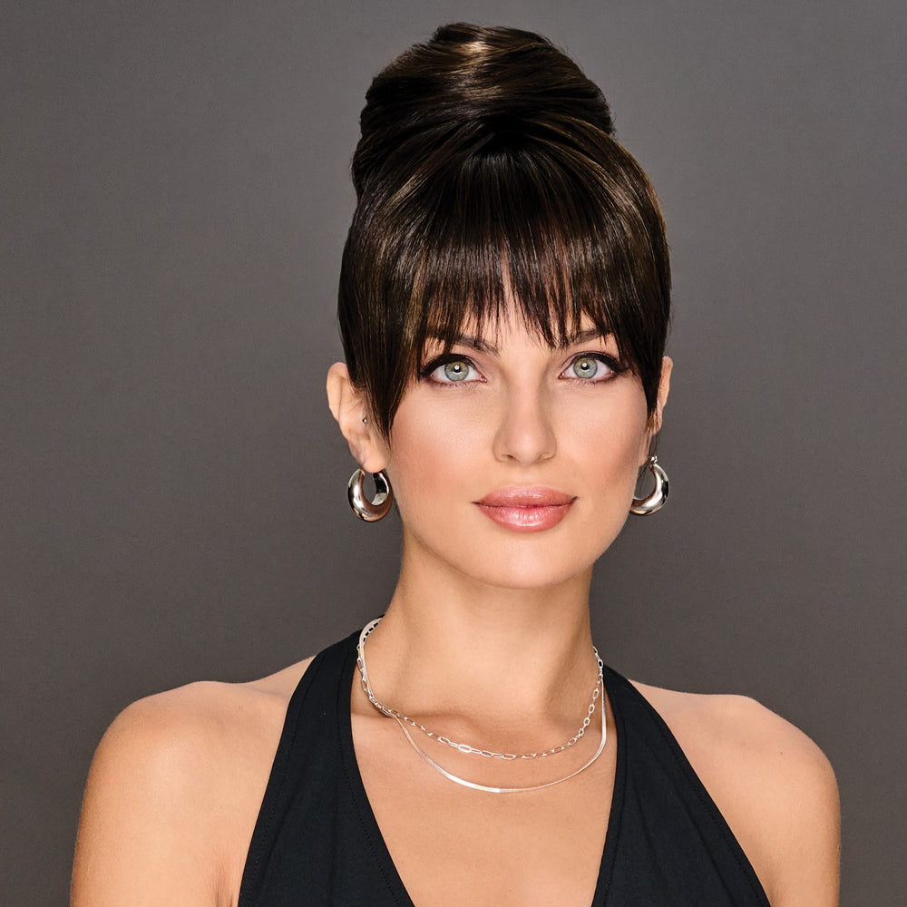 All-in-one fabulousness! Position the bangs where you like and snap in place. Then cover your baby bun with the bun hairpiece and pull the drawstring to secure. It’s a whole new look in seconds and it couldn’t be easier.