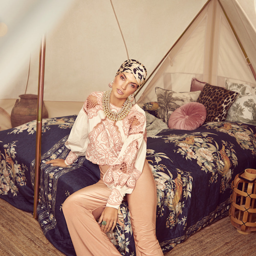 Sapphire Turban Set is a 2-piece set consisting of a base turban with a semi-attached headband and a long loose ribbon. In true boho style this set is both a glamourous, fun and creative headwear model that you can turn into just the styling you like the most. The turban is suitable to use on its own using the semi-attached headband to create a bit of extra volume. It can also be mixed with the printed loose ribbons from the other Sapphire sets or the loose ones.