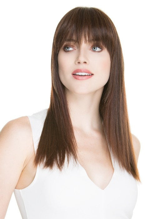 True by Ellen Wille is the clip in bang we have been waiting for! True is a face framing bang that consists of 4.75" - 8.5" long hair on a 4.25-2.5" long by 6" wide monofilament base, plus three pressure sensitive clips for a secure fit. True is created with Ellen Wille's new and innovative Prime Hair and weighs less than an ounce. Prime Hair is the perfect blend of pure human hair and heat resistant synthetic fiber. This is workmanship at its finest creating the perfect wearing experience. True is part of the Ellen Wille Prime Power collection.
