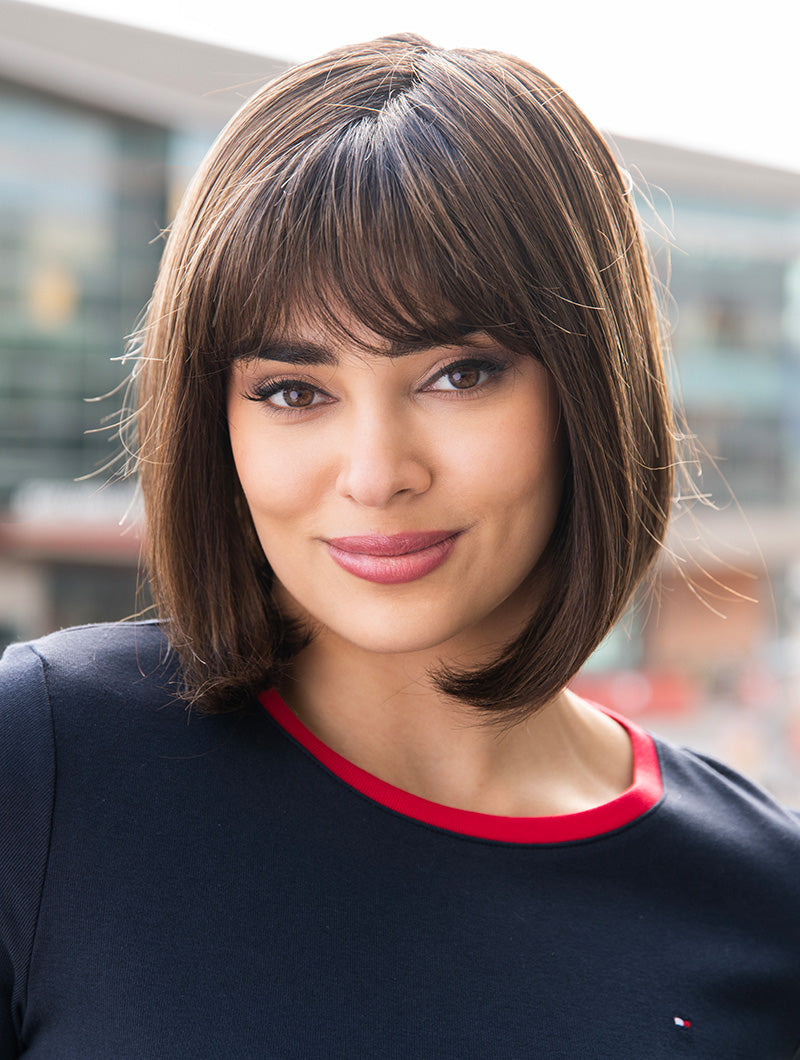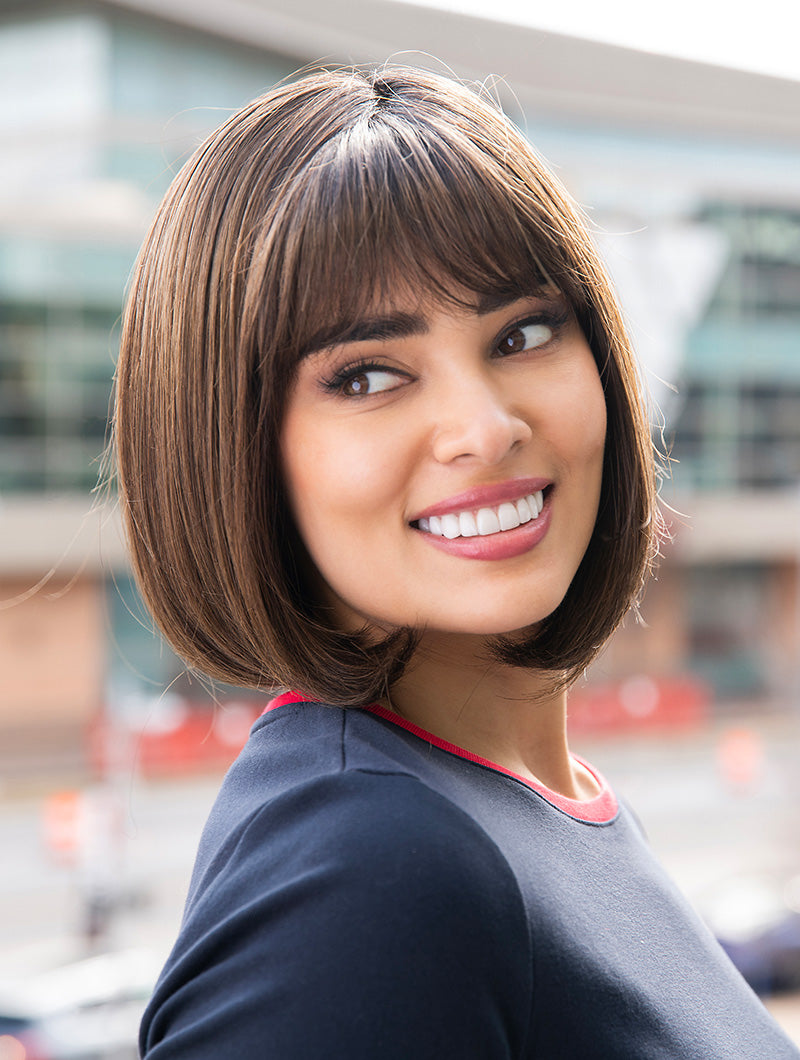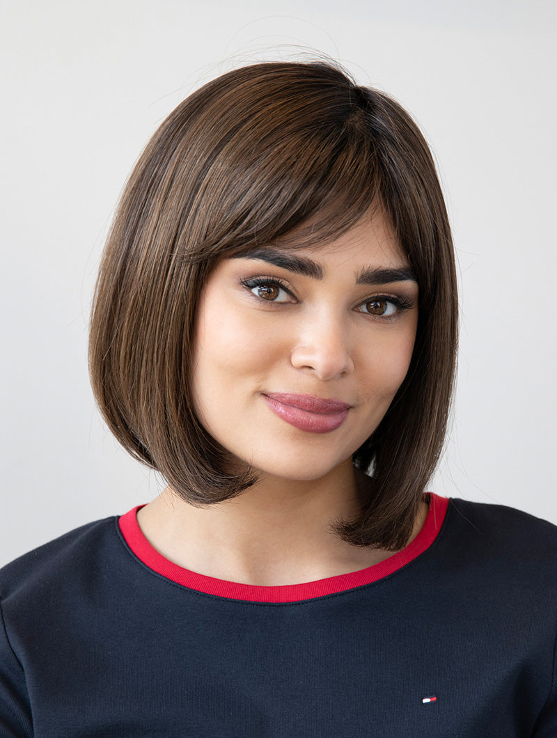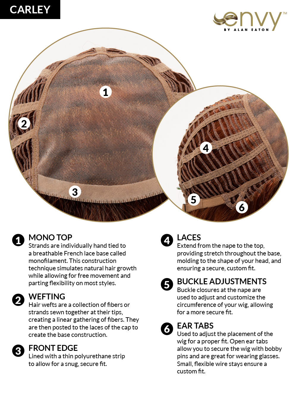 Carley by Envy creates a new presentation to a timeless style. The soft face framing layers and wispy bangs makes this style as easy fit straight from the box. Minimal styling is required, just comb this lightweight style in place and you are ready to impress. Mono top construction offers the latest in hand-tied features making this style an easy casual fit for most wearers.