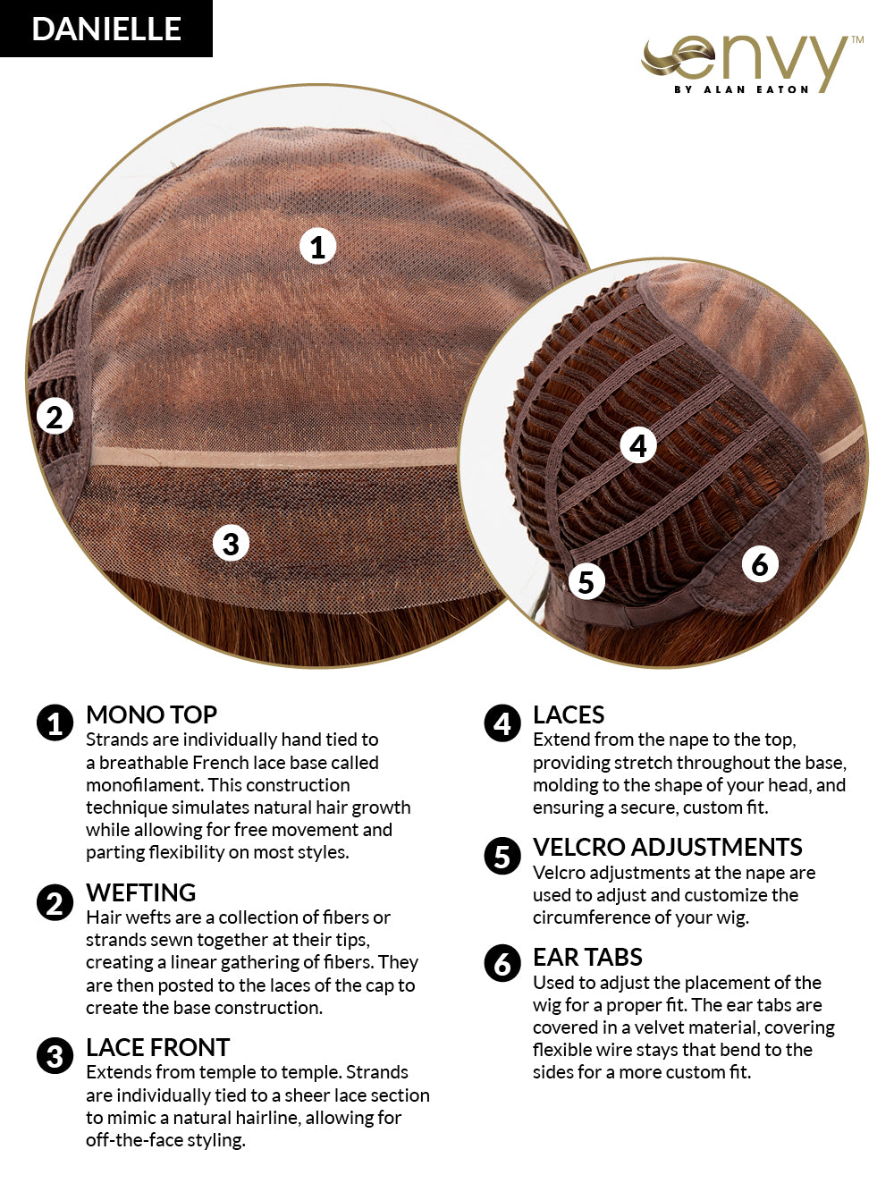 Danielle by Envy features the latest in heat friendly fiber with its unique blend of 30% human hair and 70% synthetic fiber. Envyhair was developed to give a high tech alternative to human hair products. The fiber itself allows usage of most heat appliances up to 210 degrees with moisture controlled properties that will allow your style to last all day. Brush, style and comb with ease. Envyhair behaves naturally while maintaining the fell and texture of human hair. Danielle is constructed with mono top and machine made sides and back Wear it straight or add a touch of curl to reflect your own personality.