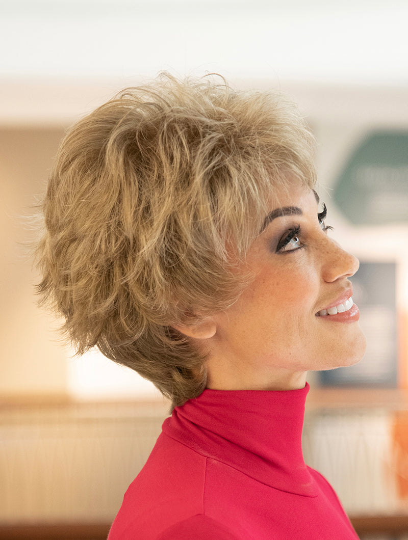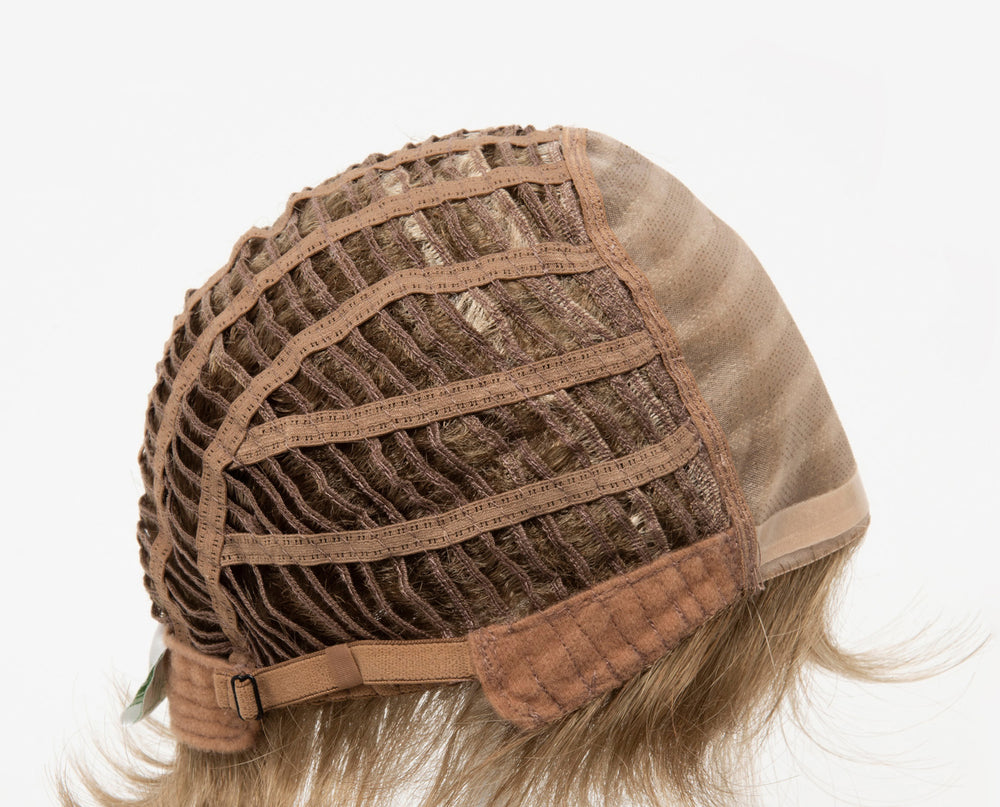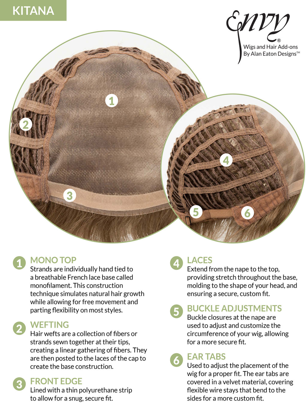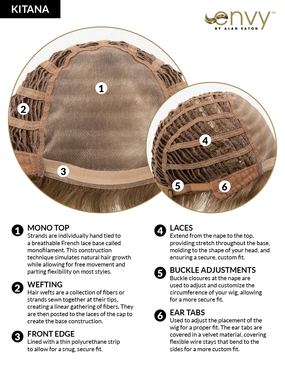 Kitana by Envy is spunky, textured and exhibits layers galore! With its tapered extended nape Kitana offers a soft hugging neckline. Razored edges that frame the face give that deconstructed styling for today's style conscious women. Mono top construction allows flexibility is styling so that you can add a little lift with your favorite styling products or comb it from side to side to suit your individual needs.