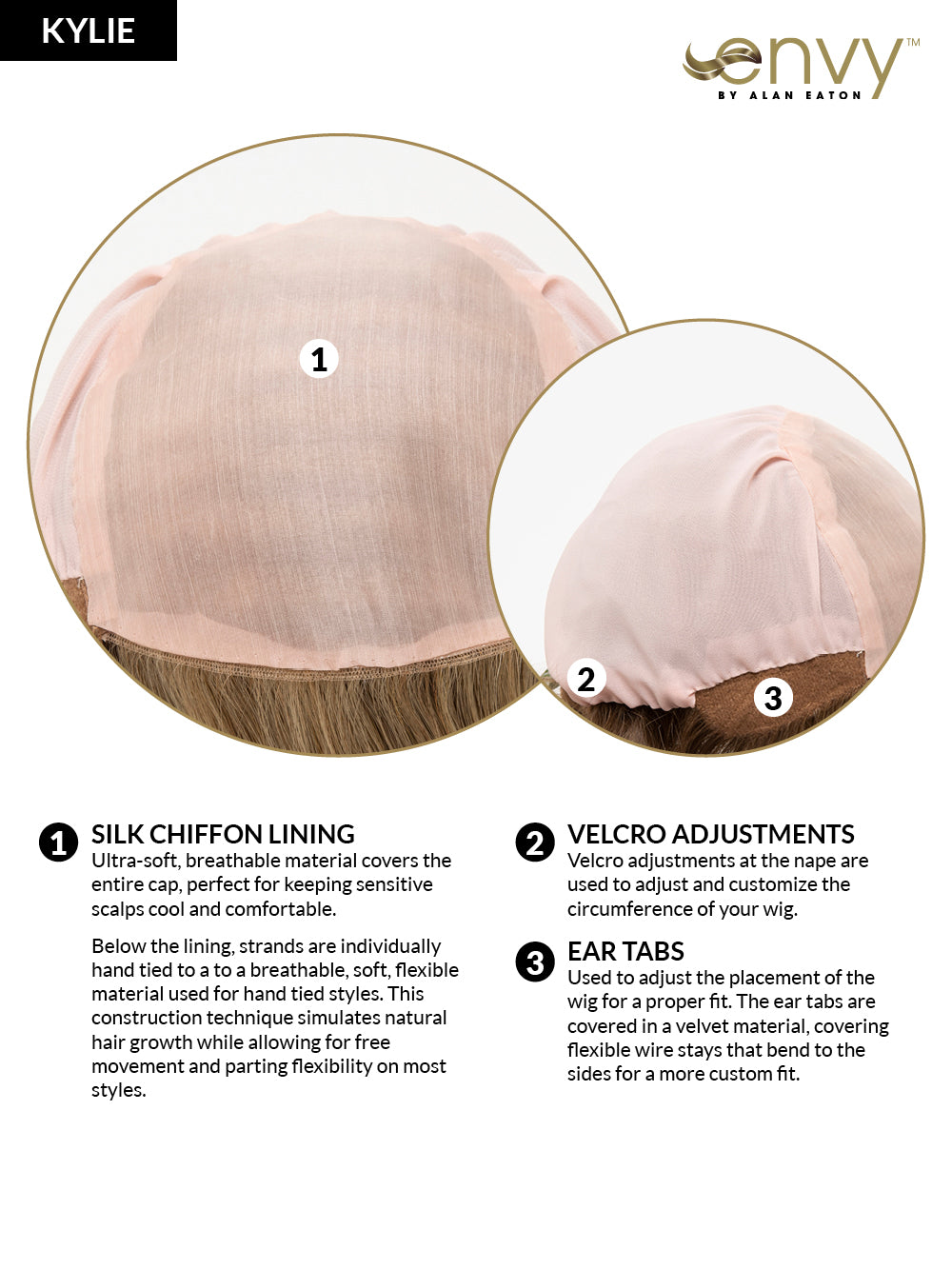 Kylie by Envy features the latest in heat friendly fiber with its unique blend of 30% human hair and 70% synthetic fiber. Envyhair was developed to give a high tech alternative to human hair products. The fiber itself allows usage of most heat appliances up to 210 degrees with moisture controlled properties that will allow your style to last all day. Brush, style and comb with ease. Envyhair behaves naturally while maintaining the fell and texture of human hair. Kylie is constructed with mono top and hand tied sides and back with a soft chiffon lining for the more sensitive scalp.