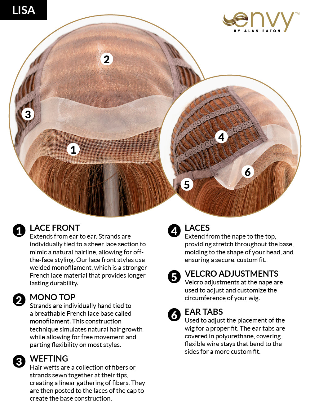 Our NEW LISA’s lush Lob has it all! The versatile just-past-the-shoulder cut can be worn as a casual low pony, blow-dried, or curled—thanks to EnvyHairTM, our exclusive human/synthetic hair blend that looks, feels, moves, and styles just like the real thing. And with ENVY’s Ear-to-ear Lace Front providing the most natural looking hairline available, you might forget it’s not the real thing.