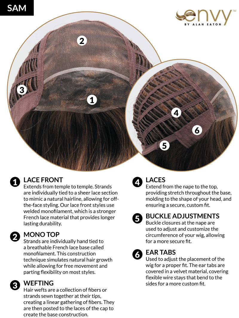 Bouncy bombshell-blowout meets chic, shoulder-length style! Sam’s lace front, mono top construction allows for a natural, fresh-from-the-salon look. Adjustable straps and velvet ear tabs make it feel as good as it looks.