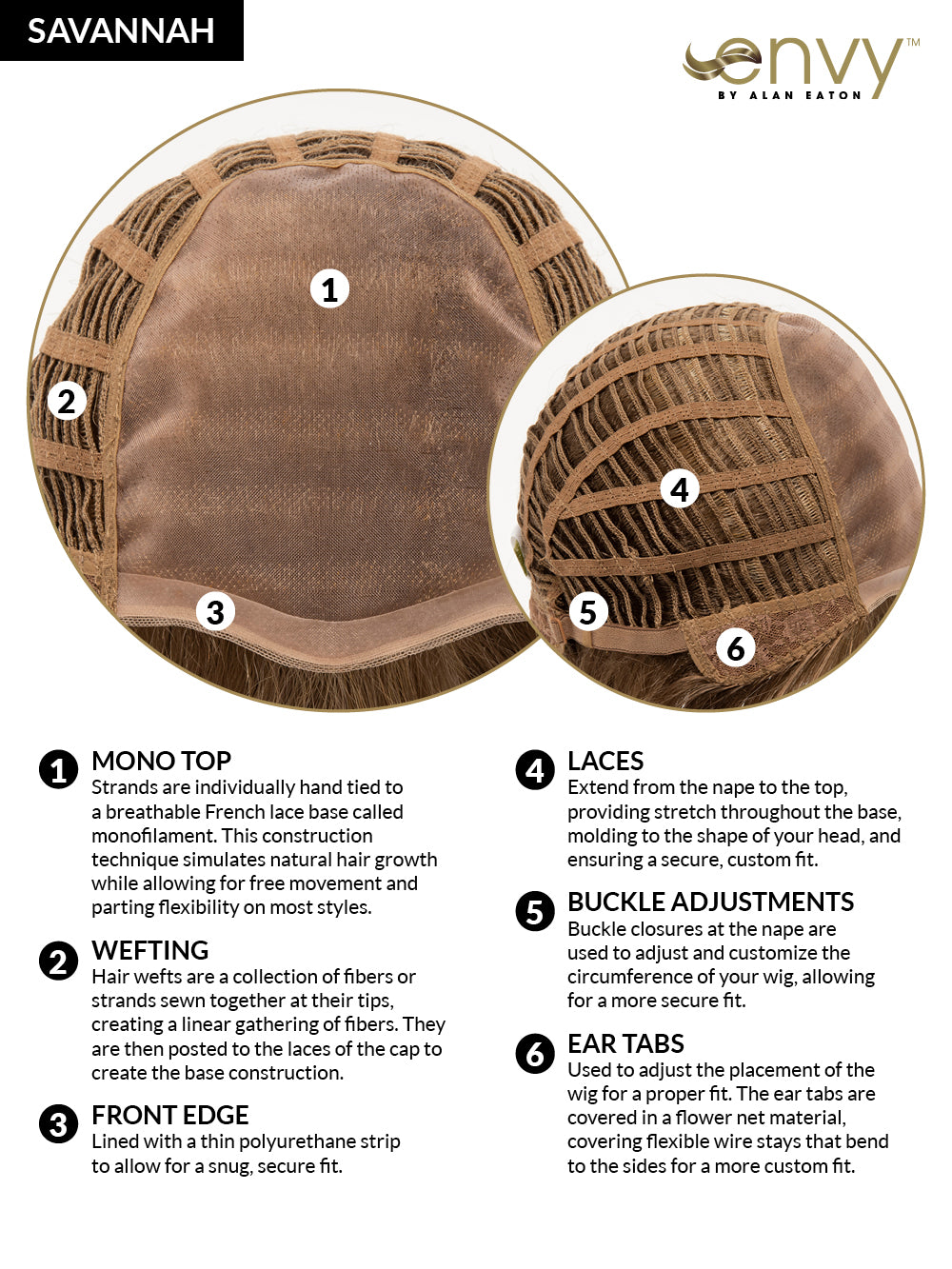 Savannah by Envy offers a tossled Long Layereding through the top with soft volume while tapering to collar length layers at the nape for the easy breezy signature styling from Envy. Constructed with a mono top and wefted sides and back makes Savannah a natural for women of all ages.