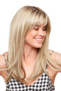 Elegant sideswept bangs and cascading long layers exude chic allure. The hand tied mono top allows for versatile styling in any direction — let your imagination reign!