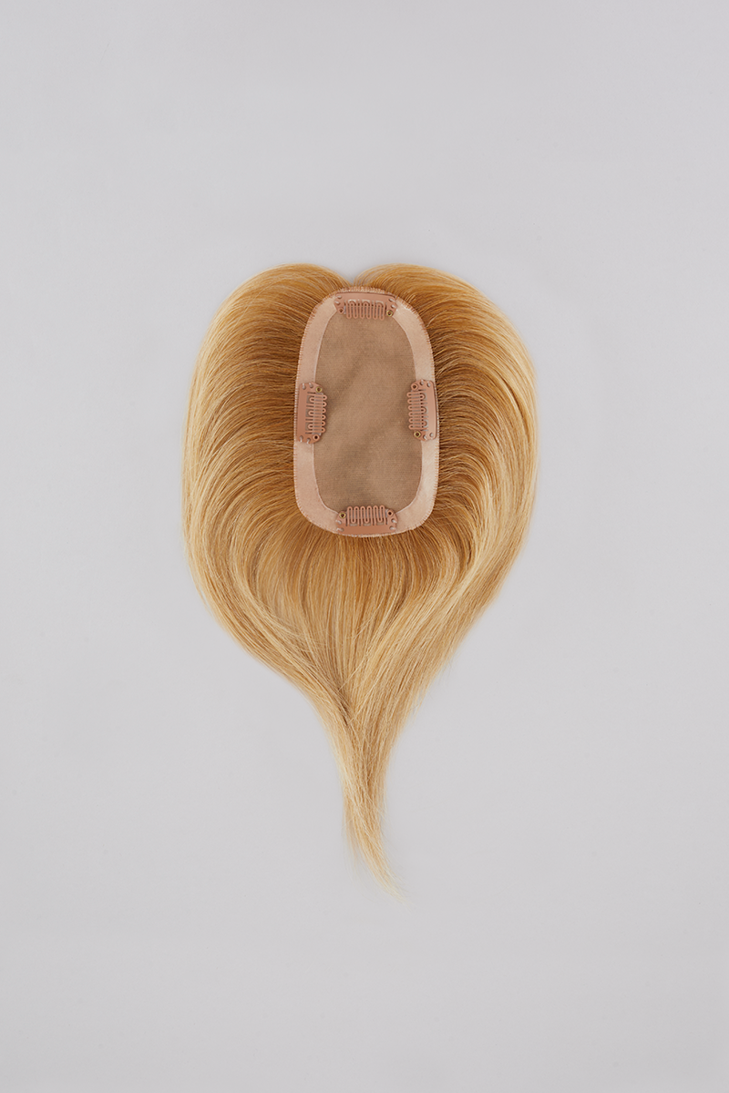 This clip in topper, worn over the part, adds volume to short styles with beautiful Remy human hair. The design is hand tied using French knotting, a superior knotting technique that creates the most natural appearance possible.