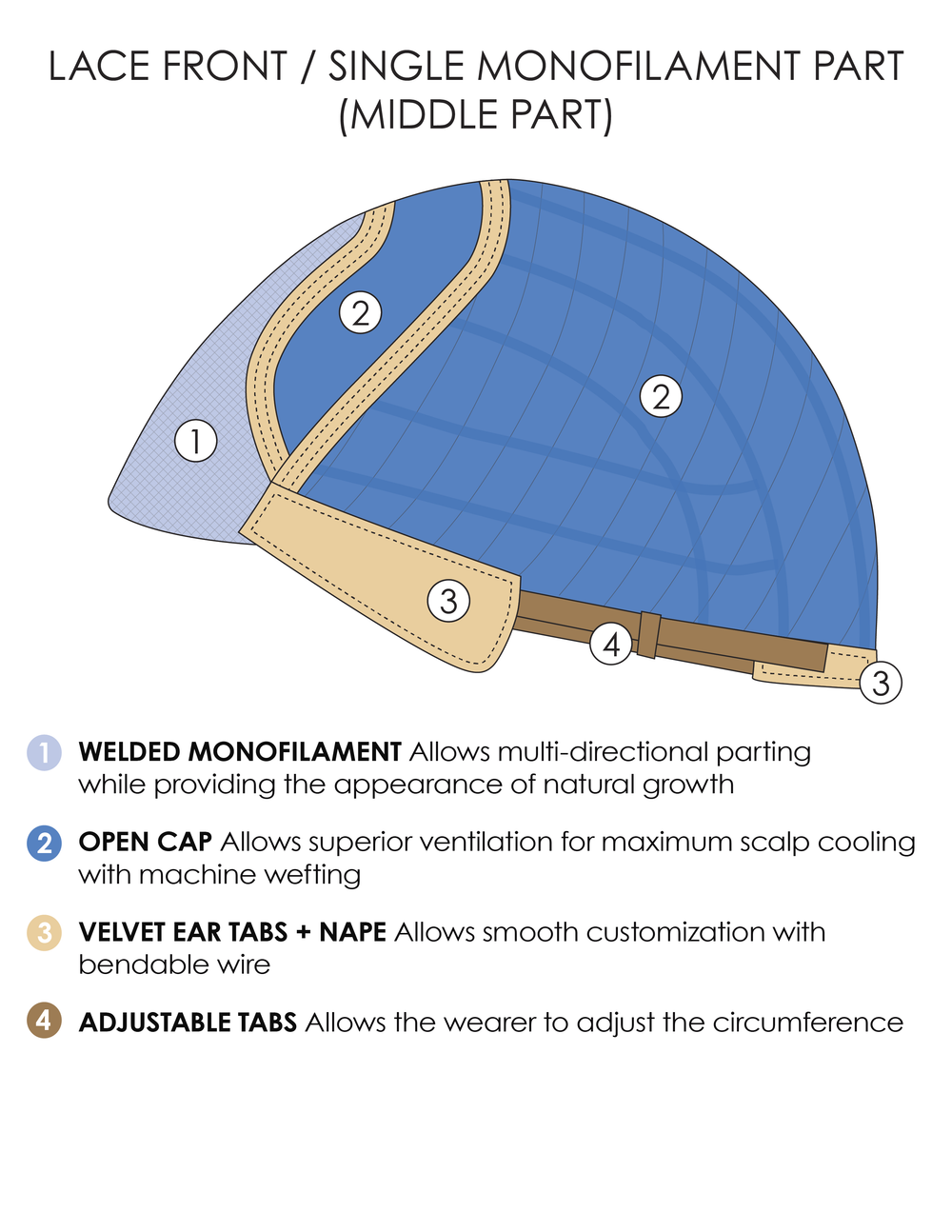 - Cap Design: Lace Front / Single Monofilament Part (Center)