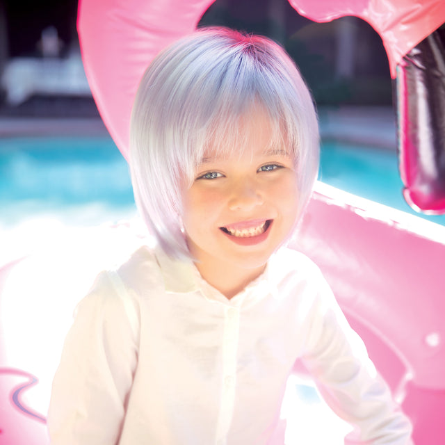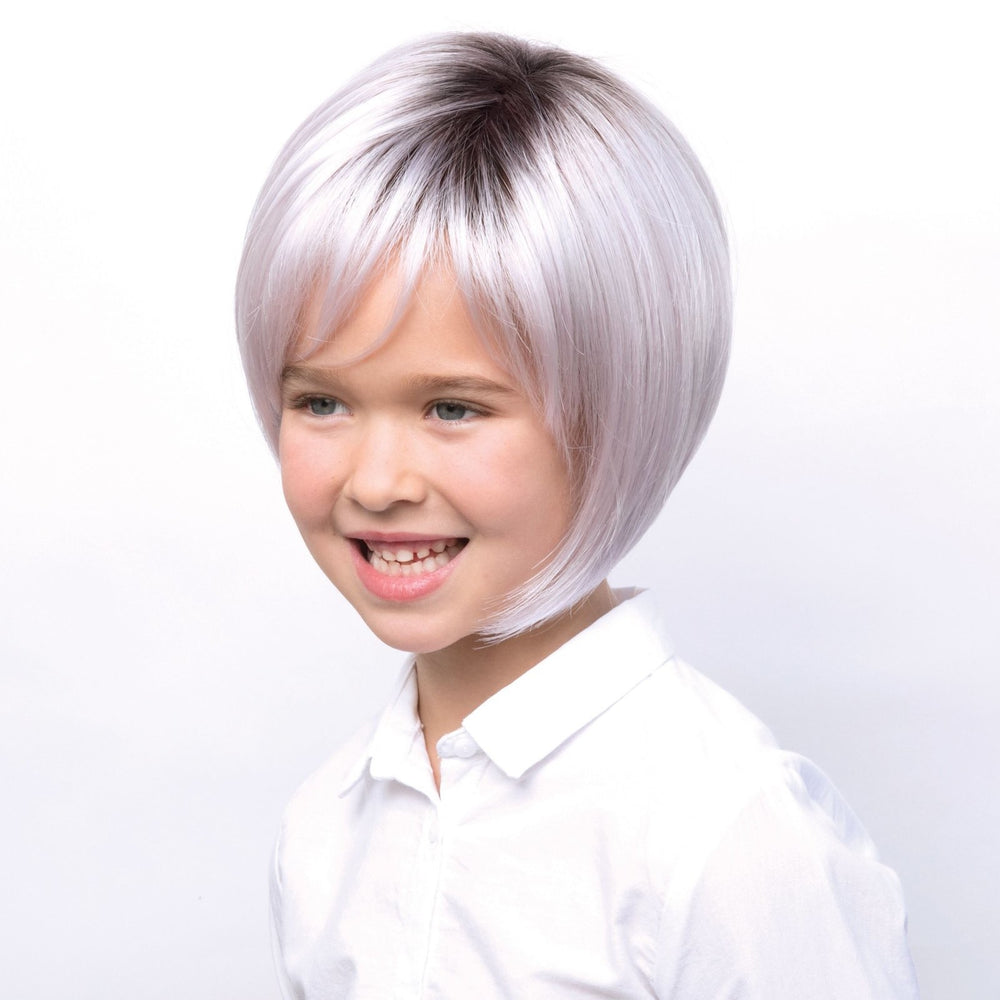 Kensley from our Amore Children’s Collection is a short synthetic wig. This straight ready-to-wear wig is an A-Line bob with side swept fringe for versatility. Our children’s lace front with lace cap wigs are light weight, comfortable, wefted and with an invisible hairline for ultimate comfort. Kensley cap includes lace front plus lace part with full monofilament top covered by soft material with elastic lace that allows cap to stretch for more flexibility.