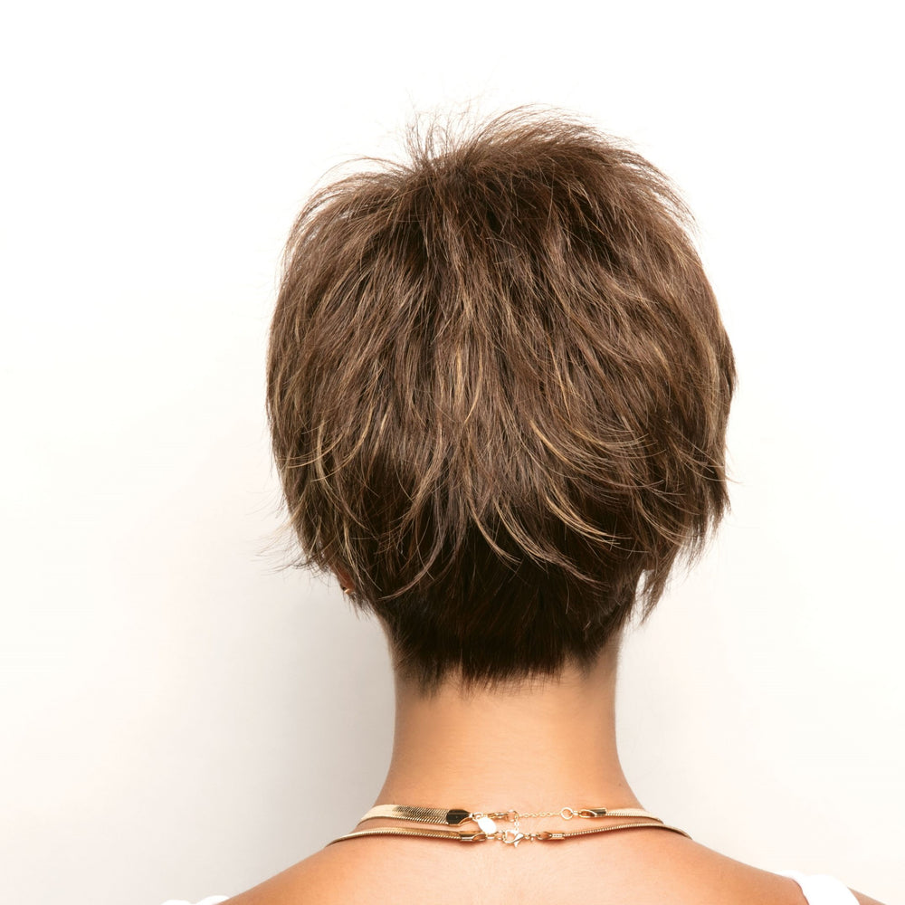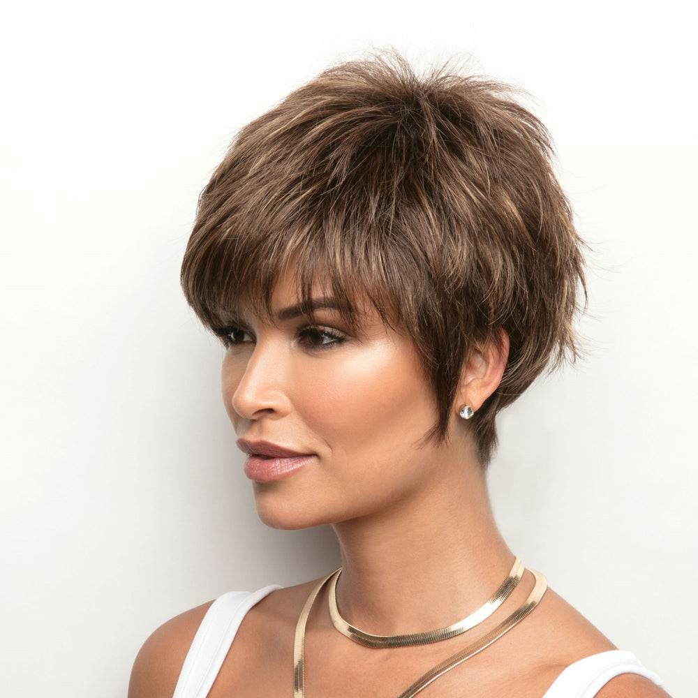 Billie from our Noriko Collection is a short-length synthetic wig. This straight ready-to-wear wig is a short spiky and flattering style for a decidedly edgy look. Featuring wispy bangs and a tapered back that hugs the nape. Billie is machine made with adjustable tabs in the back nape area to allow a more comfortable fit. The result is a comfortable fit with a natural look that is both fashionable and easy to wear.