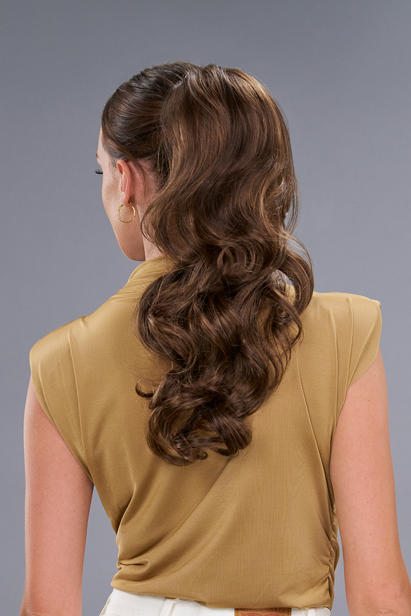 Foxy is an extra-long, clip-in ponytail that easily clips on with a claw comb or optional drawstring bun base. Foxy adds instant glamour to any style with its length and beautiful waves