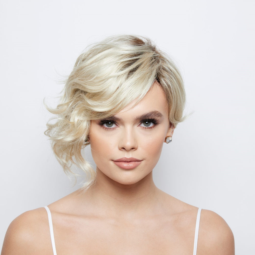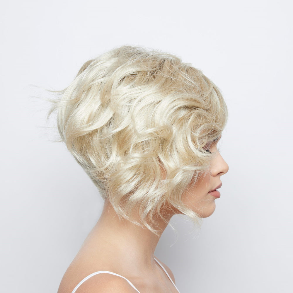 Vee from our Alexander Couture Collection is a medium-length synthetic wig. This curly ready-to-wear wig is a runaway inspired asymmetric cut with bouncy curls. Vee is Monofilament top with adjustable tabs in the back nape area to allow a more comfortable fit. The Monofilament top gives you a light breathable base and a more realistic appearance to create a natural illusion which allows you to change the direction of the part on the wig. It provides the ultimate versatility and comfort