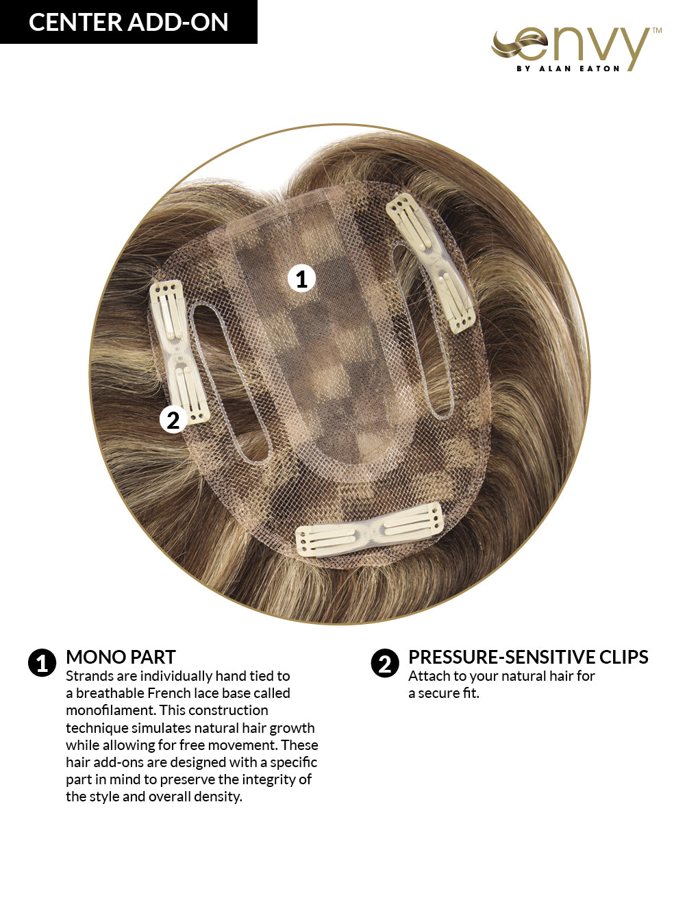 Featuring individually Hand-Tied Strands to simulate natural hair growth and Pressure Sensitive Clips for a more secure fit, ENVY’s ADD-ON, CENTER lets you wear it with confidence.