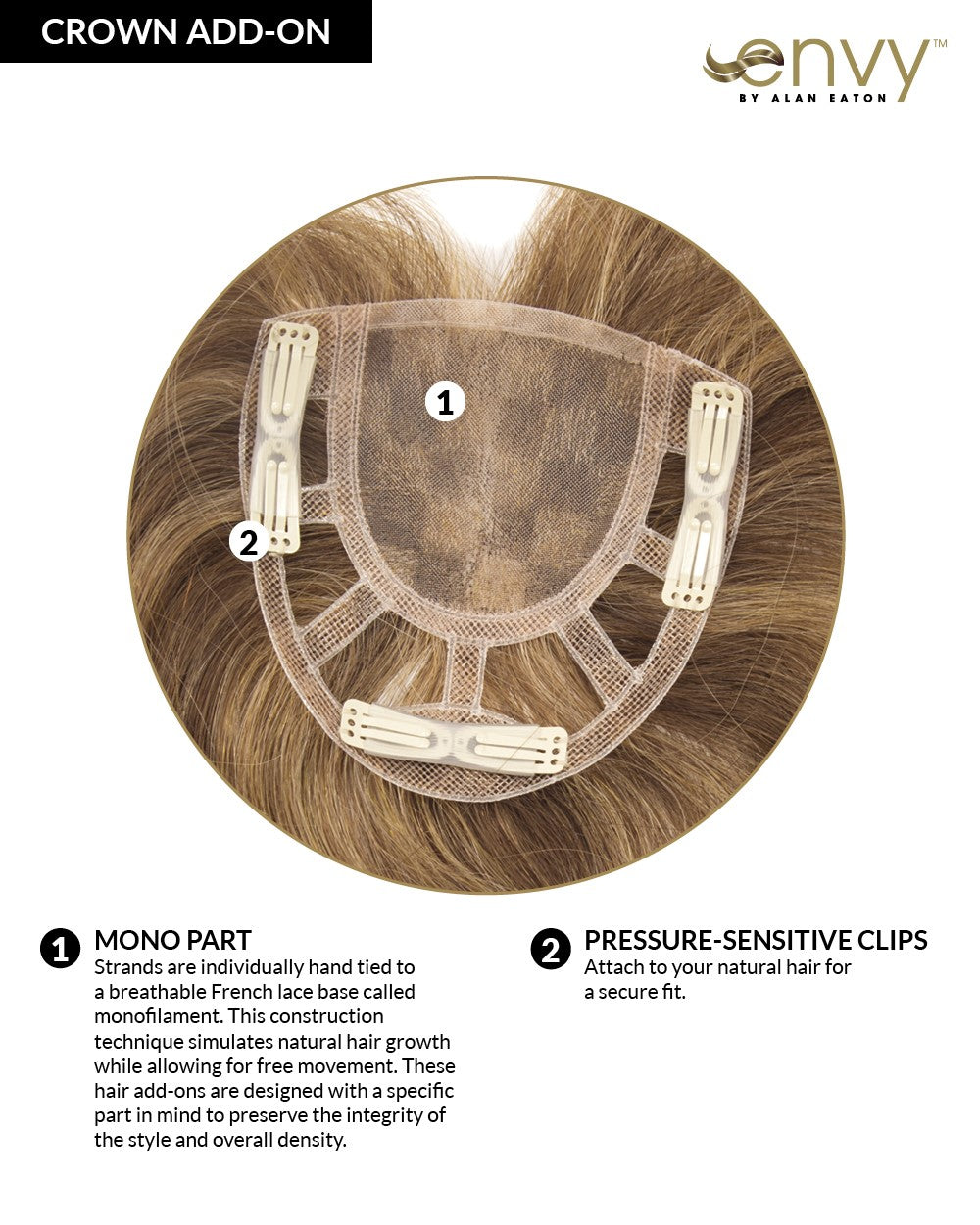Featuring individually Hand-Tied Strands to simulate natural hair growth and Pressure Sensitive Clips for a more secure fit, ENVY’s ADD-ON, CROWN lets you wear it with confidence.