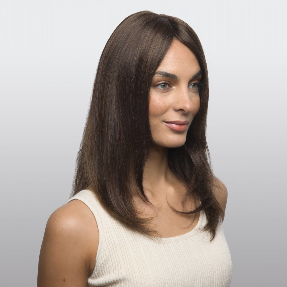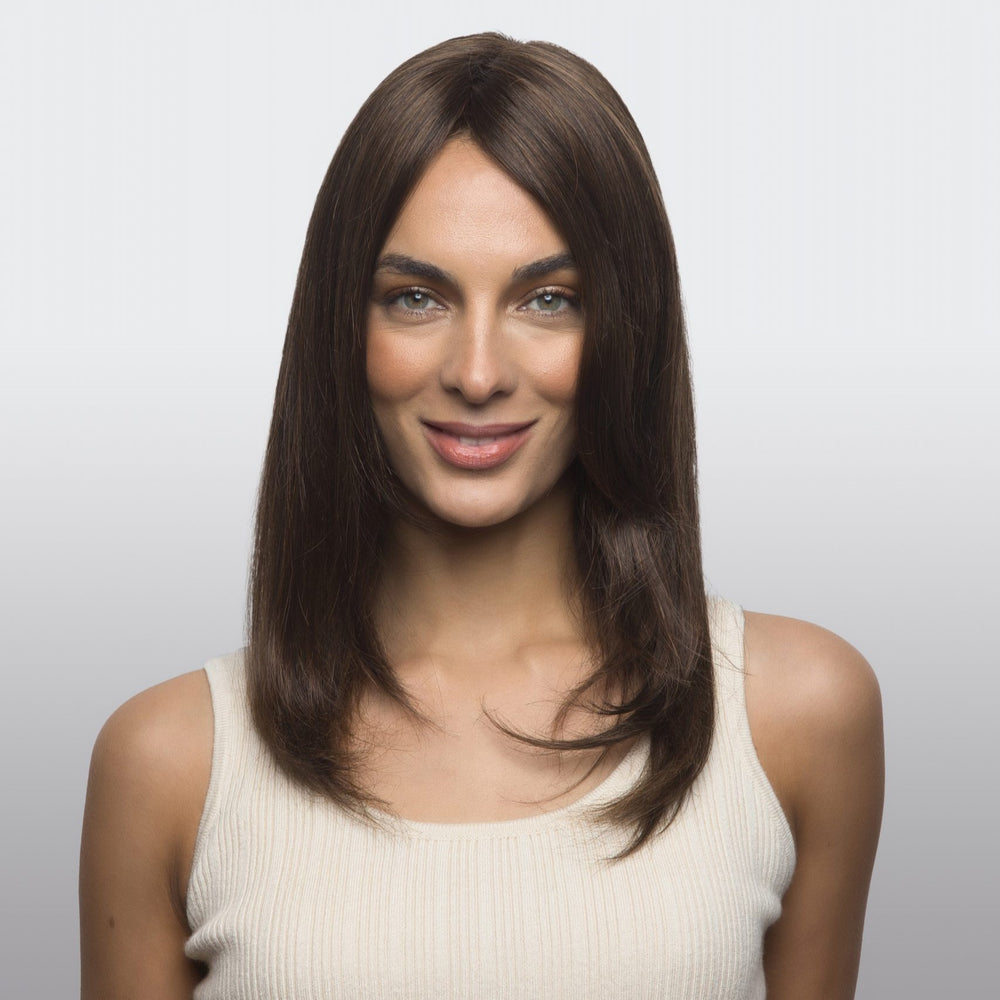 Our Flex top piece from our Amore collection is a synthetic hair piece. This straight hair enhancer is a simple way to add density and coverage. It’s Monofilament base includes a soft wire perimeter technology for the perfect fit. The Flex TP will give you a light, breathable base and provides the ultimate versatility and comfort. This topper can be worn as a highlighter or filler and covers the top of the head from fringe to crown.