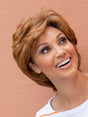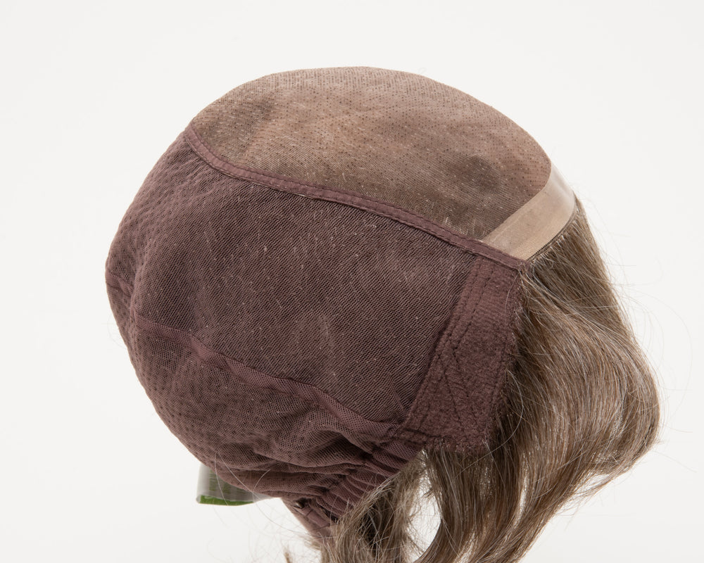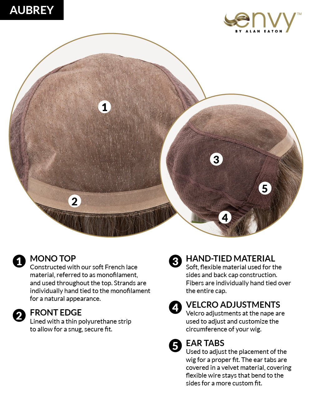 Aubrey by Envy features the latest in heat friendly fiber with its unique blend of 30% human hair and 70% synthetic fiber. Envyhair was developed to give a high tech alternative to human hair products. The fiber itself allows usage of most heat appliances up to 210 degrees with moisture controlled properties that will allow your style to last all day. Brush, style and comb with ease. Envyhair behaves naturally while maintaining the feel and texture of human hair. Aubrey is constructed with mono top and hand-tied sides and back. With the hand-tied features through-out, you never need to worry that anyone will know that you have anything but fabulous hair!